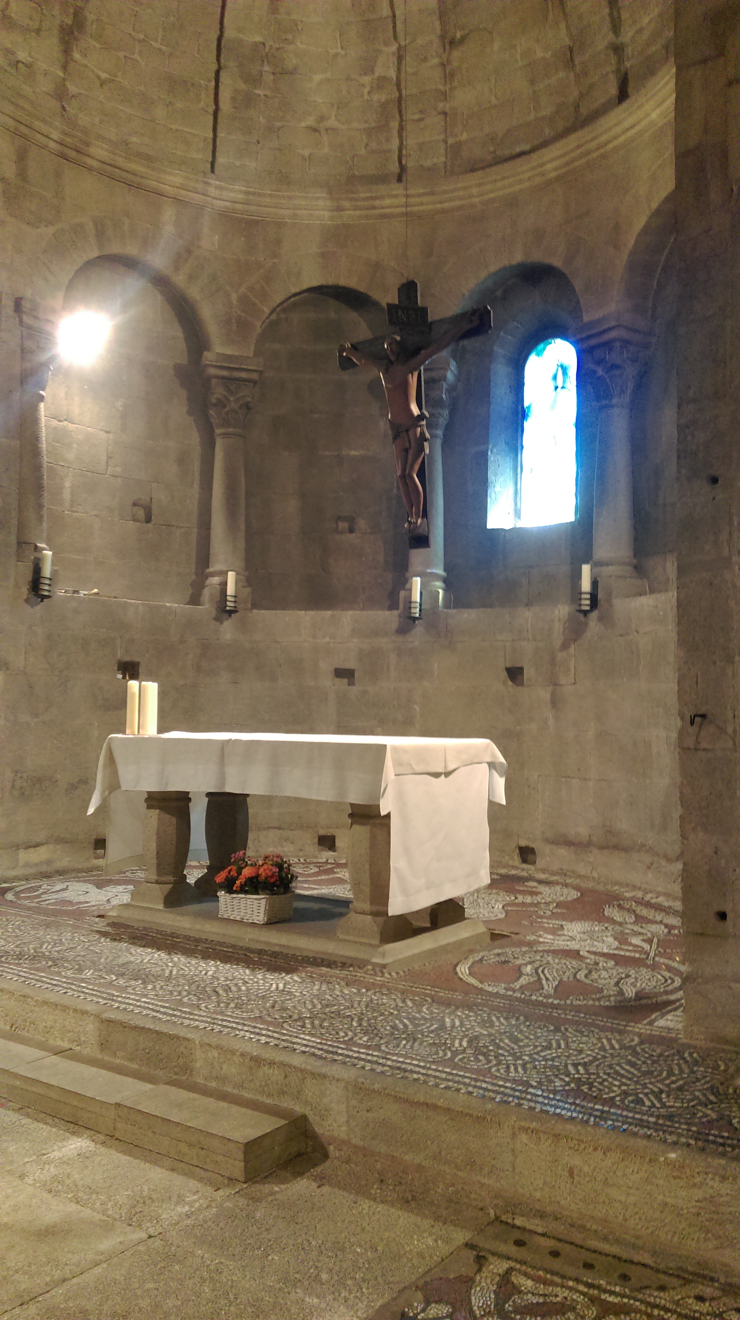 Posté le 28/08/2019 à 20:11"Le chemin pour aller à l'abbaye est déjà une étape avant d'arriver sur les lieux. Petite route au milieu d'une forêt de chênes, virages en lacets, on gravit la colline déjà en silence. Arrivée au parking, la marche continue qui longe le murs d'enceinte de l'abbaye, invitation à la méditation en s'asseyant sur une grosse pierre qui longe le chemin et enfin la chapelle d'un pur roman, épurée, vitraux contemporains splendide, au pied de l'autel une mosaïque du XI ème siècle de toute beauté. Une porte permet d'apercevoir le cloître. Attention la chapelle n'est ouverte que de 15 à 17h et c'est le seul bâtiment visitable."